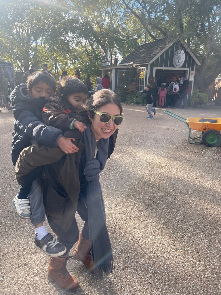 We arrived late in the afternoon. The light was warm and low, the kind of golden glow that seems to slow everything down. After the maze and the pumpkin picking, we found a quiet spot near the edge of the property where a wide old tree stood alone near the fence line. The kids sat underneath it, sticky from cider and dirt, still talking over each other, still spinning out their energy.
